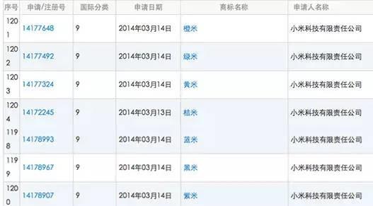 小米科技有限责任公司注册了“大米”、“蓝米”、“黑米”、“紫米”、“橙米”、“绿米”、“黄米”、“桔米”等商标.