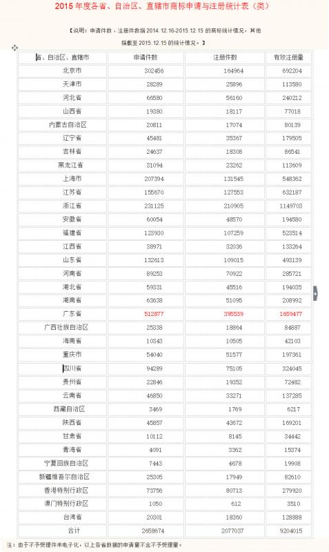 说明:申请件数、注册件数指2014.12.16-2015.12.15的商标统计情况,其他指截至2015.12.15的统计情况。